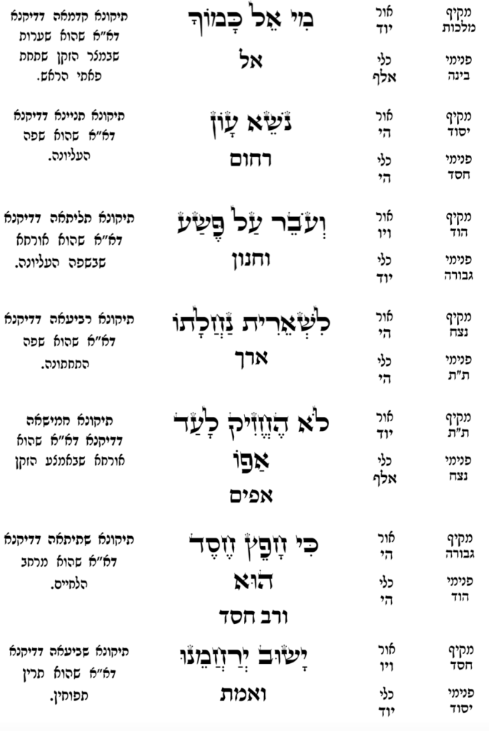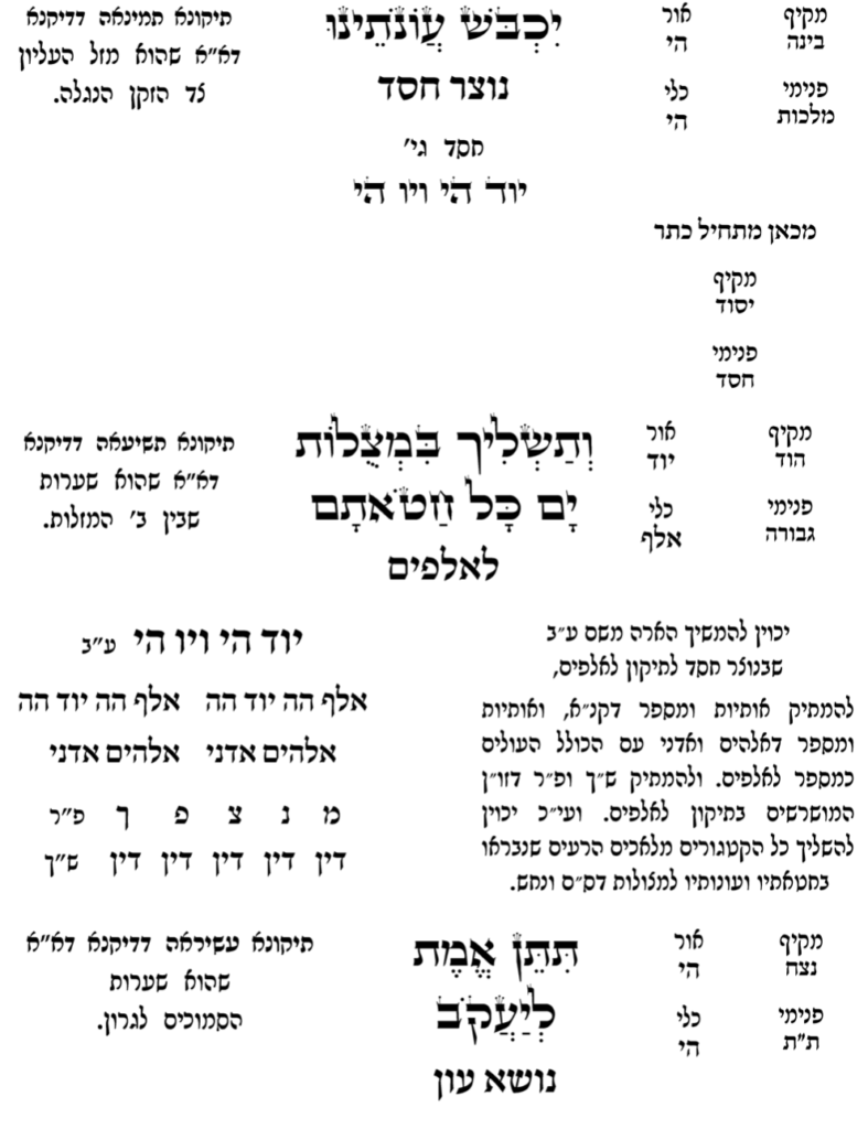 Now we completed the first set, and do the same for the next three sets, from top to bottom, for 12 dips in the Mikvah. On the 13th dip, we unify all the names together. Then as the man goes out of the Mikvah (and gets covered), be mekaven that he’s drawing down God’s 13 Attributes of Mercy, as below: