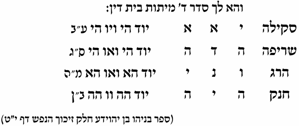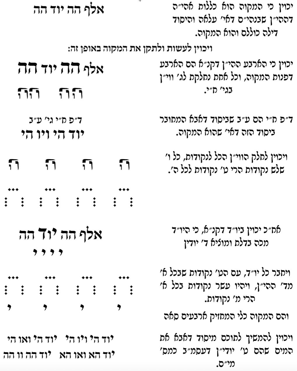 Then, one needs to take a dip for every letter of the 3 names אדני יהוה אהיה which are associated with the 4 death penalties, juxtaposed vertically as the figure below.