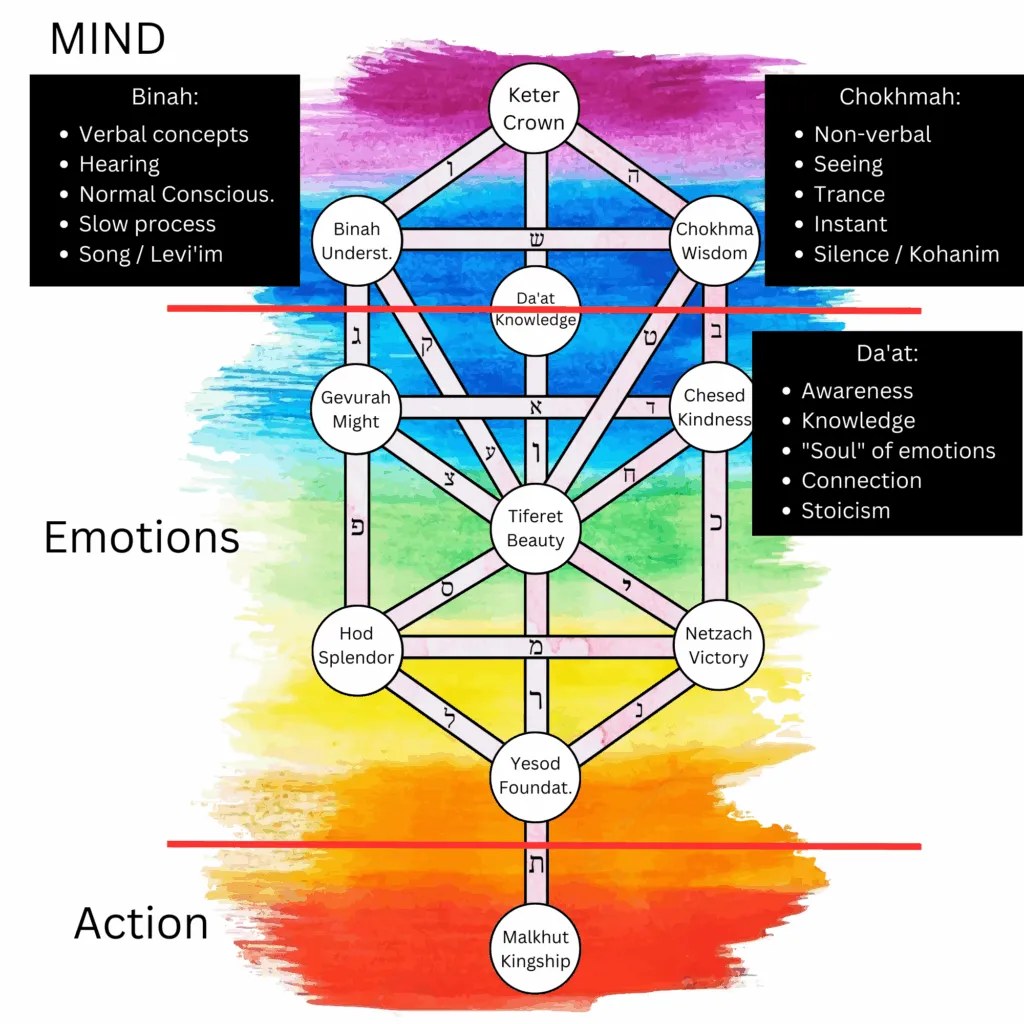 Da’at Tachton, by contrast, descends into the realm of the lower seven Sefirot and serves as the conscious transmission of those higher lights into emotional reality. It takes the clarity forged above and applies it to the structure of the soul below. This aspect of Da’at is essential for spiritual integration. Without it, the emotional Sefirot of Chesed, Gevurah, Tiferet, and so on remain disconnected from their intellectual source.